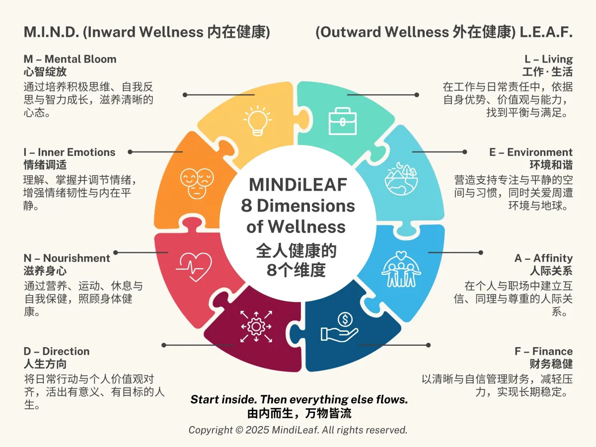 从创意表达、正念动作,到静心释放,每一项活动都与 MINDiLEAF 八大维度 中的一个或多个维度相呼应,并可根据你的目标、场地与参与者客制化调整。